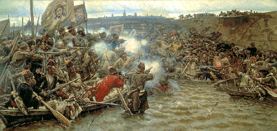 Выставка в Государственном историческом музееВыставка «Сибирское взятие», открывшаяся в Государственном Историческом музее 27 сентября, относится к серии историко-патриотических выставок, которые постоянно проходят в ГИМе, их открытие связано с юбилейными датами в истории нашего Отечества. Именно обилие дат, скорее всего, не позволяет этим выставкам быть долгими, они играют роль календаря: наглядного, снабженного вещественными и документальными экспонатами. Календаря, открытого для всех.Василий Суриков. Покорение Сибири ЕрмакомВыставка, посвященная 425-летию похода Ермака и началу освоения русскими Сибири, разместилась в двух залах, справа от главной лестницы в здании музея. Как и все подобные выставки, она входит в основную экспозицию, и ее посещение не оплачивается отдельно. Первый зал посвящен собственно походу казаков в Зауралье, второй Сибири, народам, населявшим ее в то время, ее исследователям, самому процессу включения Сибири в экономическое и государственное пространство России. Выставка открыта для посетителей до 13 ноября.Нашему корреспонденту удалось побывать на экскурсии, которую проводили по выставке Андрей Дмитриевич Яновский, заведующий отделом Исторического музея, и Ольга Владимировна Соколова, один из авторов «Сибирского взятия». Эта экскурсия, как пояснил Андрей Дмитриевич, носила специальный характер, поскольку проводилась не для рядовых посетителей, а для музейных работников. Однако это не сделало ее менее интересной.А. Д. Яновский: Эта выставка, в основном, построена на археологическом материале. Дело в том, что мы не знаем точных, достоверных дат, связанных с жизнью и деятельностью Ермака Тимофеевича. Нет достоверных данных и о его внешнем виде, поскольку прижизненного портрета Ермака никто не видел, и, несмотря на то, что существуют какие-то поздние портреты и скульптуры, изображающие его, никто не может сказать, что вот именно так Ермак и выглядел. Не окончательно установлена и дата самого похода Ермака, называются разные годы 1581, 1582 и 1583-й. Долгое время общепринятой датой считался 1581 год это как бы начало его похода. Он еще не вошел в сибирские земли, но подготовка к походу уже велась. Поэтому 1581 год и взят за основу, и именно в связи с этой датой мы отмечаем 425-летие похода Ермака. А вот реальное пересечение условной границы, вхождение в Сибирь приходится на 1582 год, на этой дате сходится большая часть исследователей.К подобного рода выставкам мы привлекаем материалы наших архивистов, которые и к нам часто обращаются за помощью, и мы часто участвуем в их выставках своими вещевыми памятниками. В частности, здесь вы можете увидеть несколько документов из Государственного архива древних актов, которые предоставлены нам в качестве дополнительных материалов. Более того, мы получили возможность создать целый ряд изобразительного копийного материала, иллюстрирующего данное событие.Здесь же, на стендах, оружие, которым в то время пользовались казаки во время походов. При помощи мониторов, расположенных в обоих залах, посетители могут получить более развернутую информацию об экспонатах выставки и событиях тех лет.(Мы переходим во второй зал.) Здесь представлен быт народов Сибири, с которыми Ермак столкнулся, когда началось завоевание Сибири. Выставка называется «Сибирское взятие», но следует помнить,
